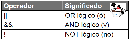 Los operadores lógicos de Java son: ! (not), && (and) y || (or). El operador lógico ! (not, no) produce falso (cero) si su operando es verdadero (distinto de cero) y vicerversa. El operador lógico && (and, y) produce verdadero solo si ambos operandos son verdadero (no cero); si cualquiera de los operandos es falso produce falso. El operador lógico || (or, o) produce verdadero si cualquiera de los operandos es verdadero (distinto de cero) y produce falso solo si ambos operandos son falsos.